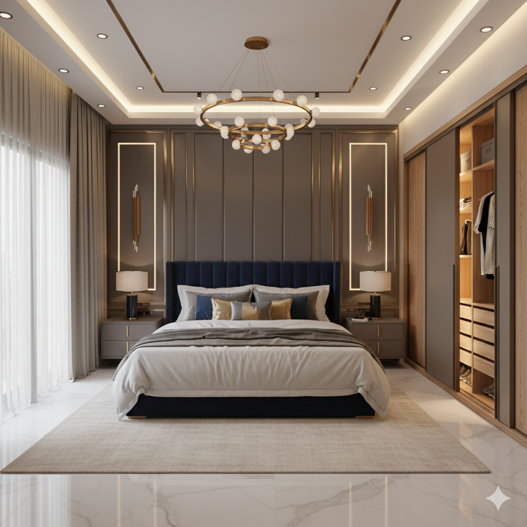 False ceilings enhance bedroom aesthetics while allowing better lighting design. The false ceiling and lighting cost typically ranges from ₹40,000 to ₹1 lakh, depending on ceiling design, cove lighting, and fixture quality.